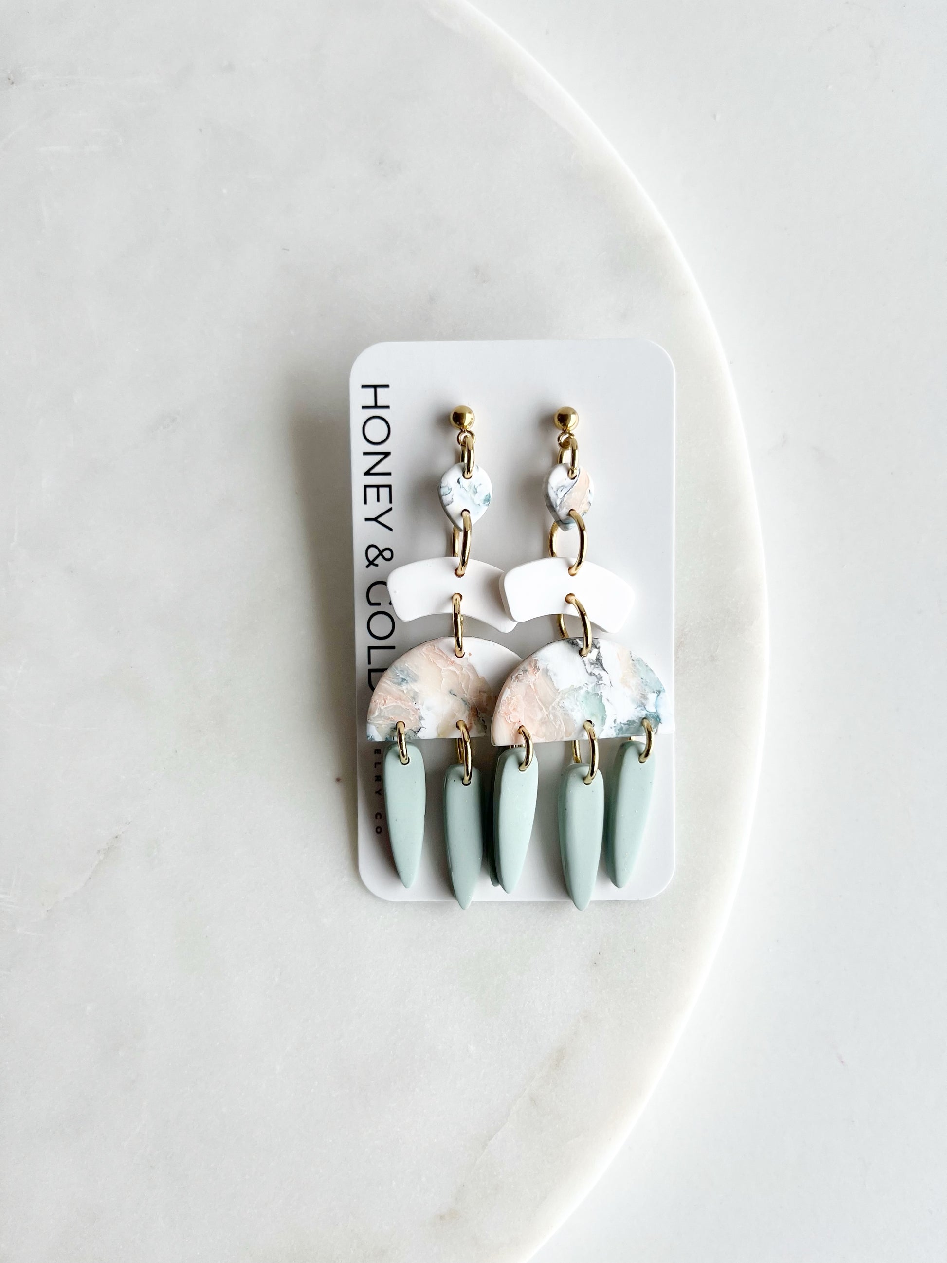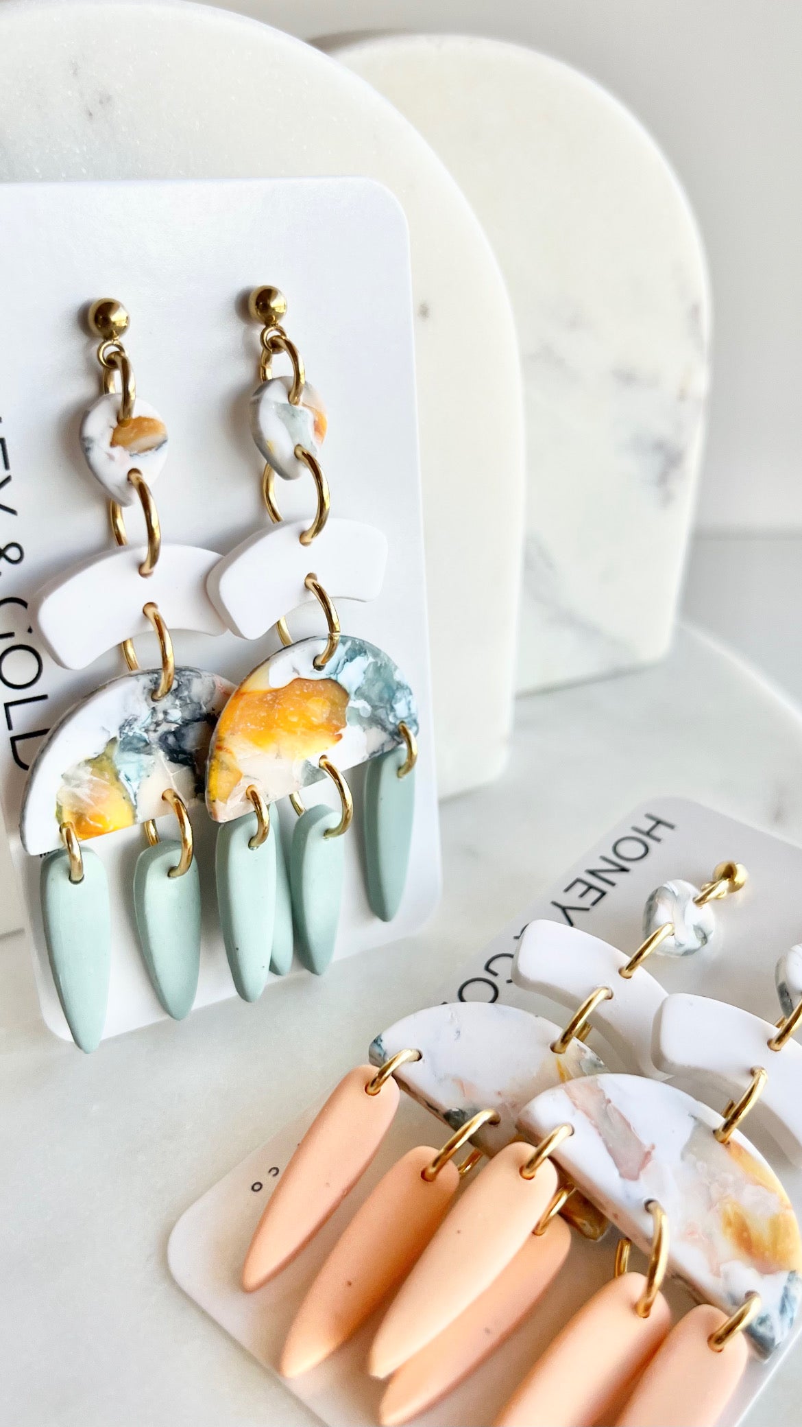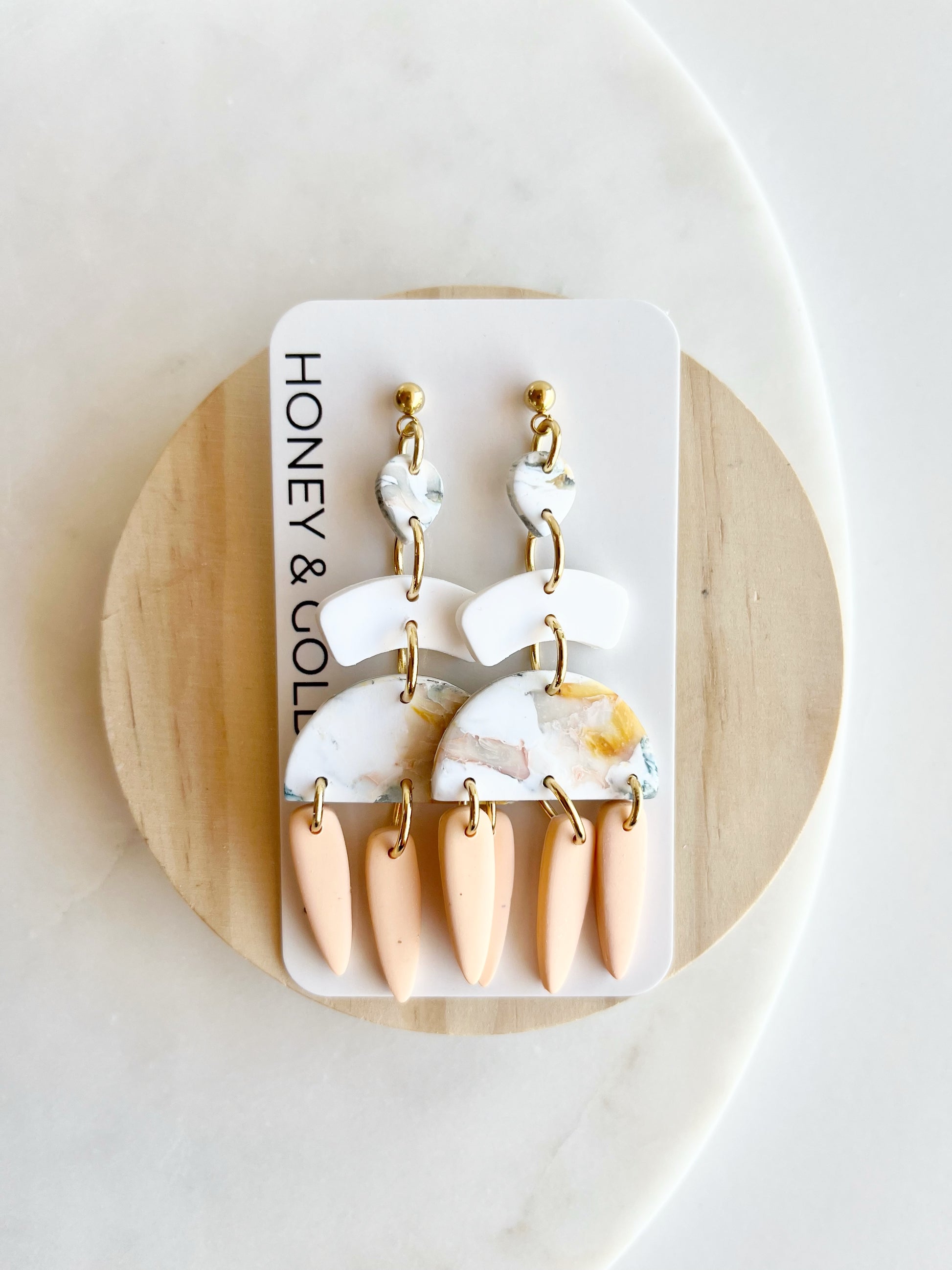 These tiered drop earrings are a dance of color and form. Featuring a marbled clay top with swirls of yellow, green, and white & peach, each pair cascades into soft arch connectors and semi-circular centerpieces, finished with elongated matte drops in earthy pastel tones. Lightweight and full of movement, these earrings blend modern edge with a painterly vibe—no two pairs quite the same.