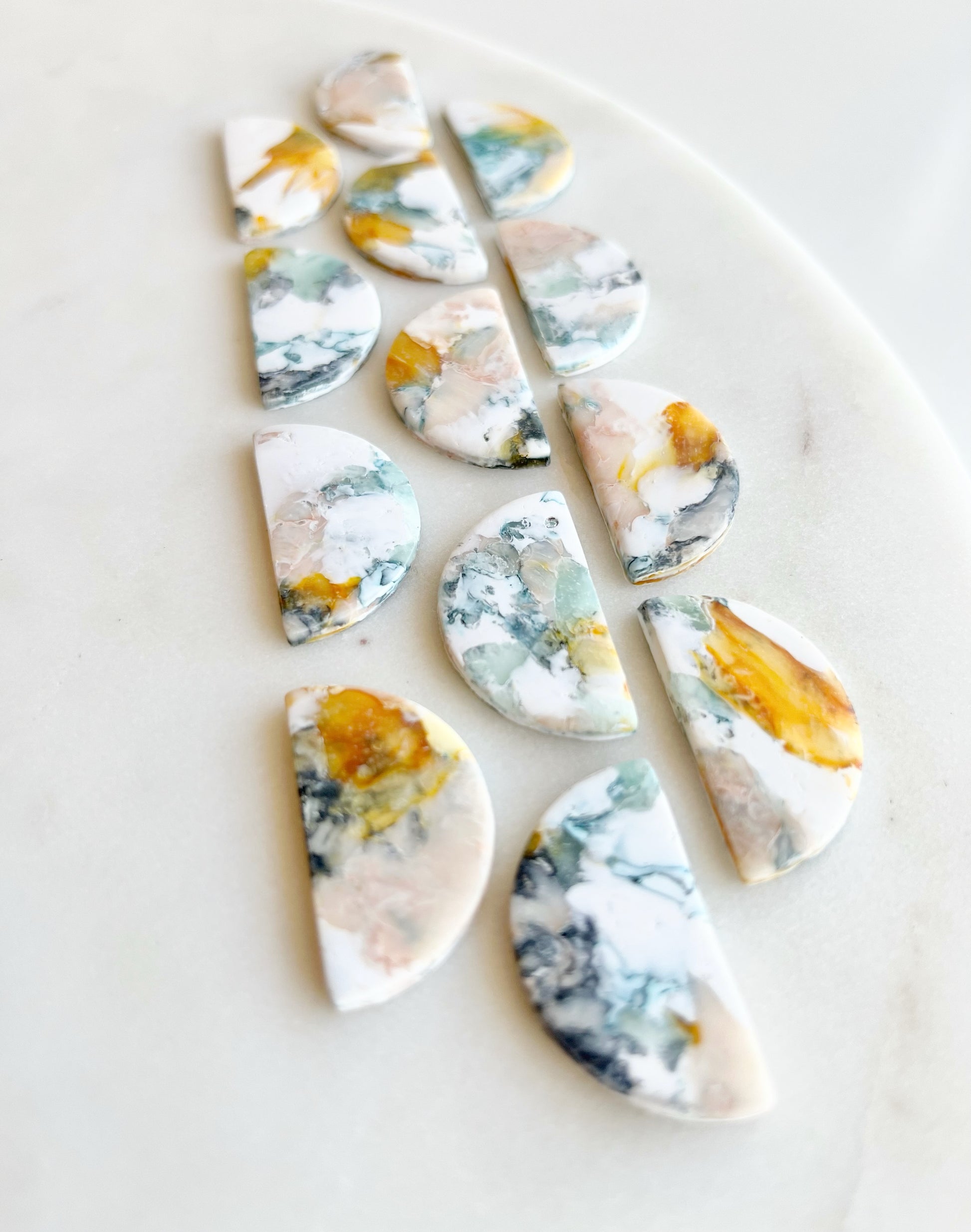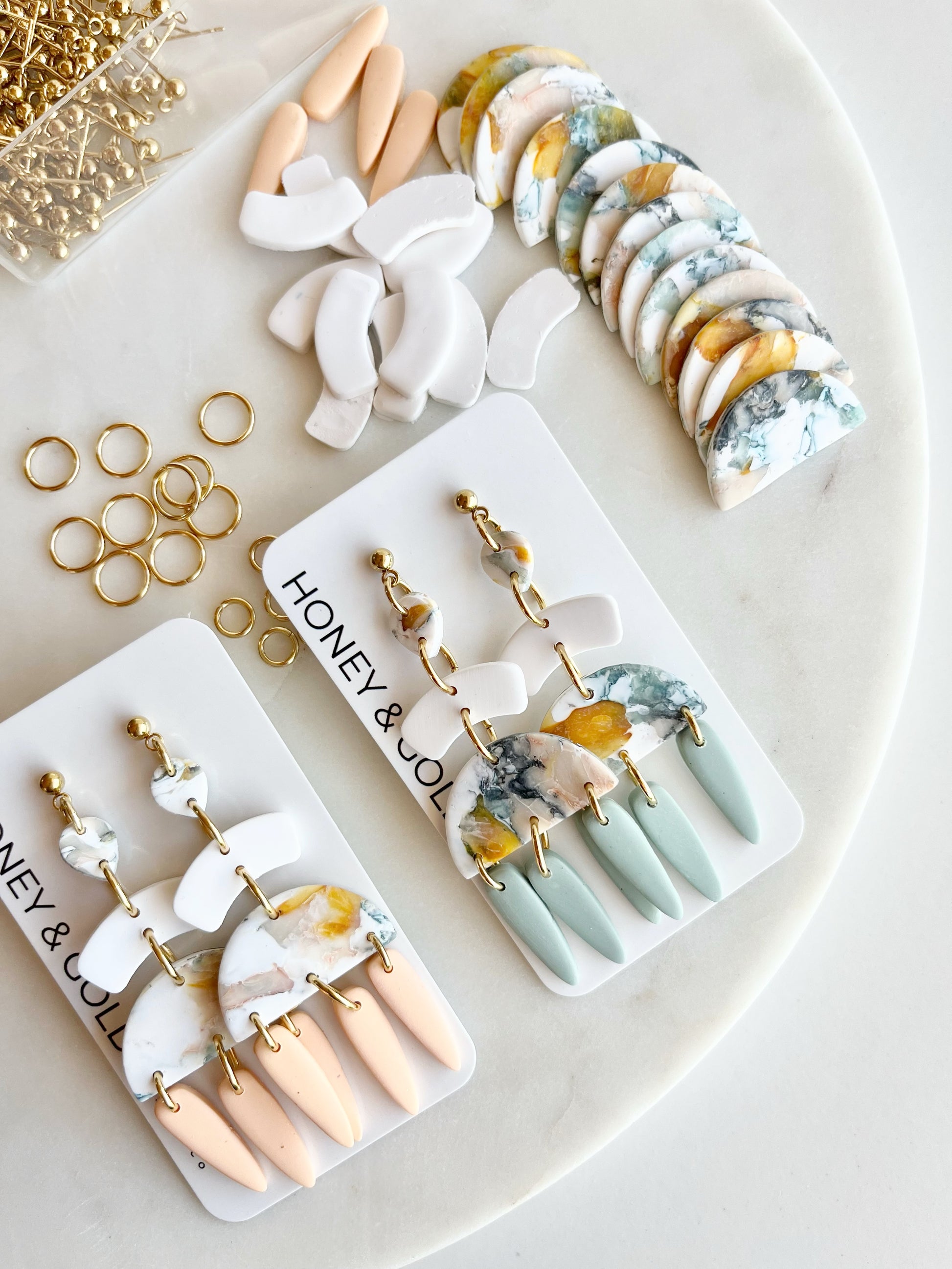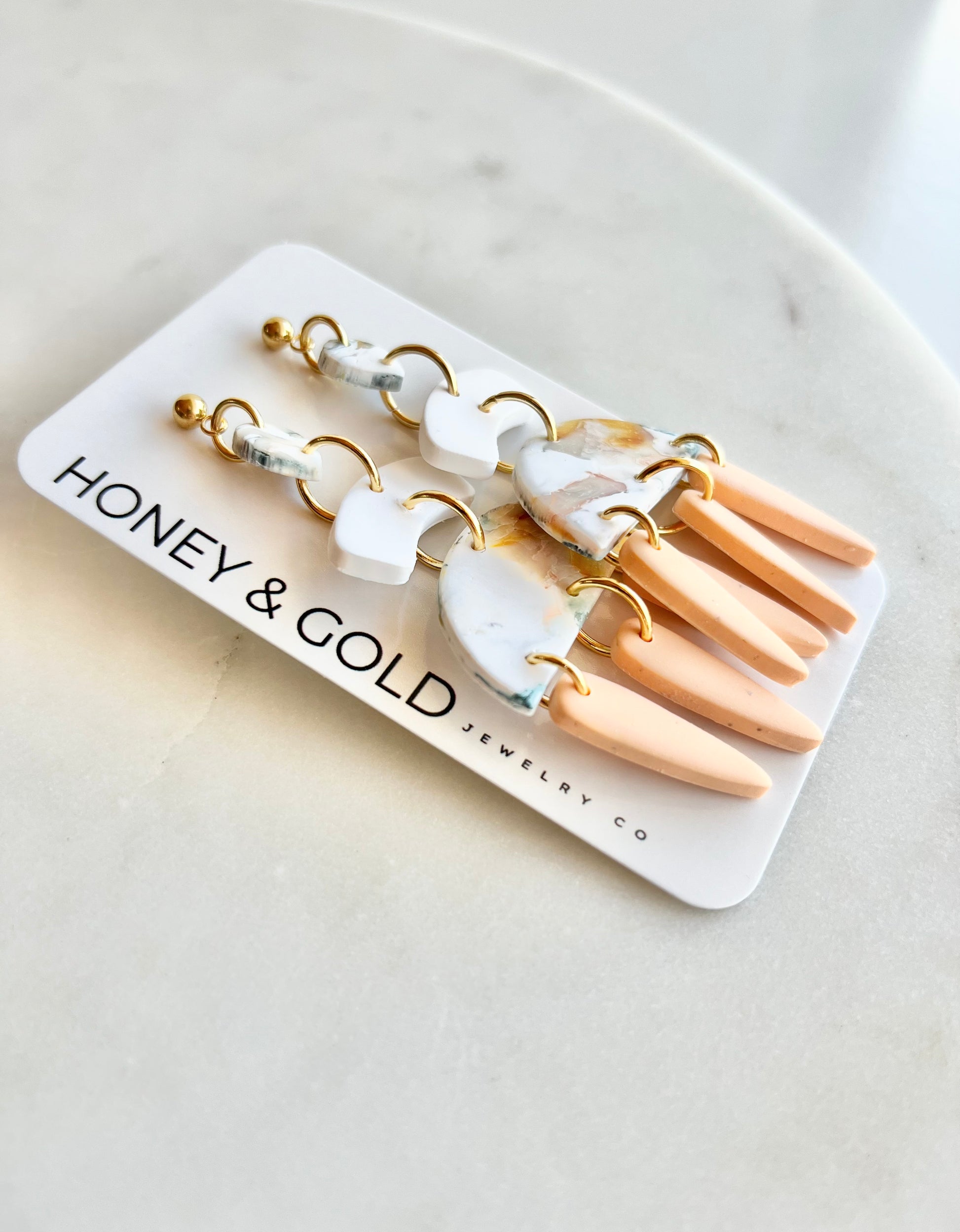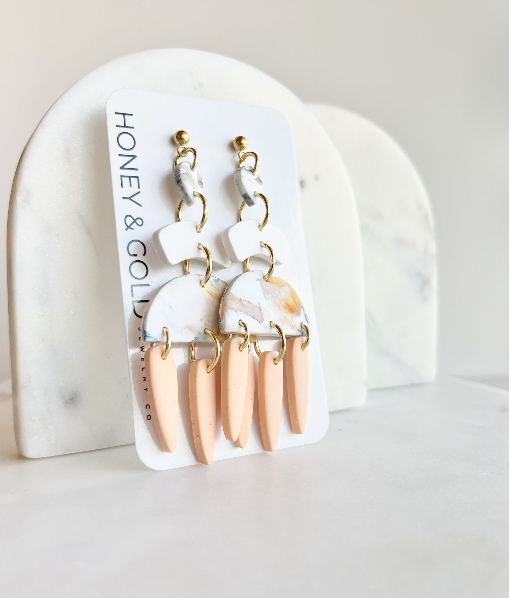 These tiered drop earrings are a dance of color and form. Featuring a marbled clay top with swirls of yellow, green, and white & peach, each pair cascades into soft arch connectors and semi-circular centerpieces, finished with elongated matte drops in earthy pastel tones. Lightweight and full of movement, these earrings blend modern edge with a painterly vibe—no two pairs quite the same.